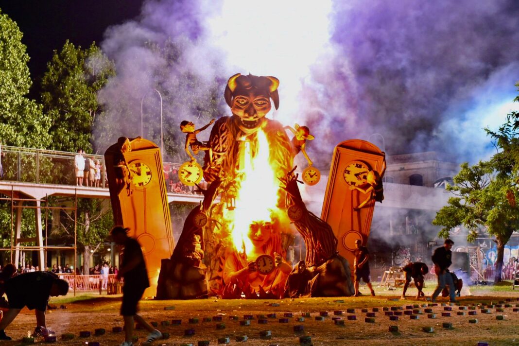 La escena se repitió en buena parte de la ciudad: música, aplausos, vecinos reunidos y el fuego devorando estructuras levantadas durante semanas por artistas y grupos barriales. Como cada año, convivieron personajes del cine, los cómics y los dibujos animados con figuras que remitieron a hechos y climas sociales del 2025.